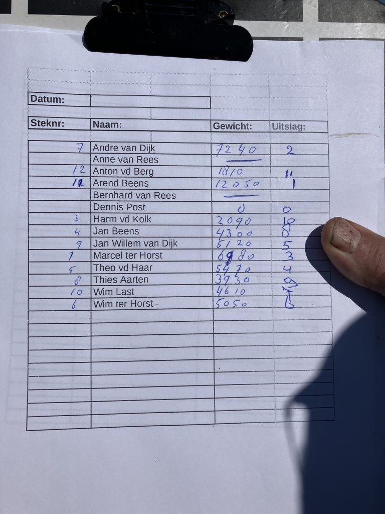 Zaterdag 11 mei werd alweer de 3e wedstrijd van de zomercompetitie gevist. Bij de loting waren 12 deelnemers aanwezig. De 12 vissers wisten ruim 58 kilo vis boven water te halen. op Arend Beens stond wederom geen maat en hij wist de wedstrijd te winnen met 12050 gram vis.